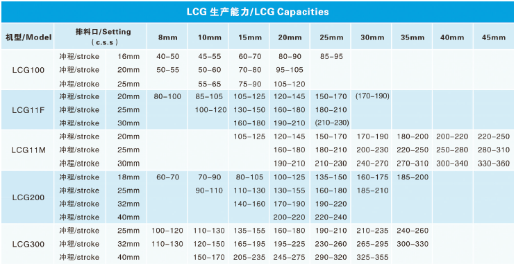 LUCKCOME LCG Series cone crushers can be easily adjusted for different production requirements. With a wide selection of cavities, the same crusher can be used in 2nd,3rd or 4th crushing stages, producing different end product sizes. The stroke change feature allows crusher through-